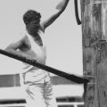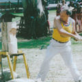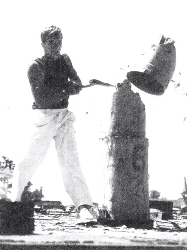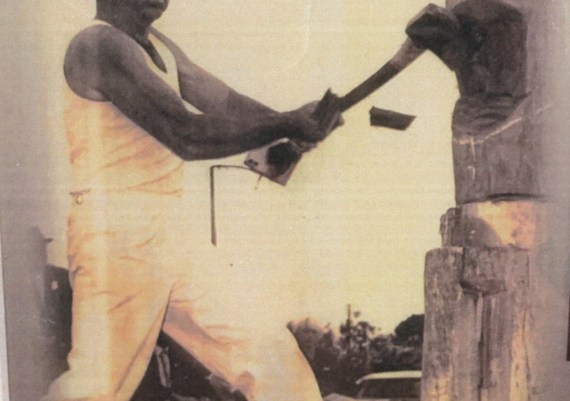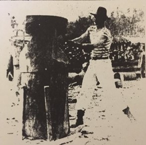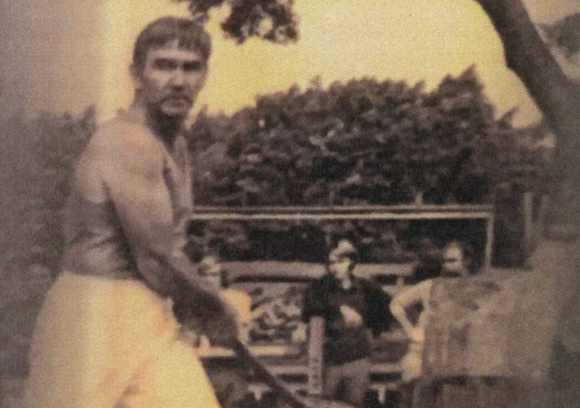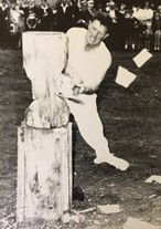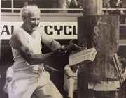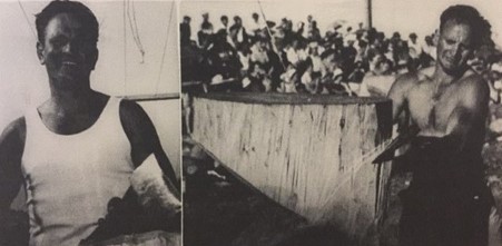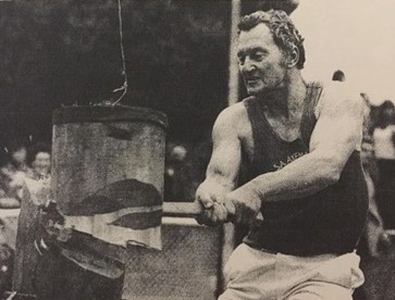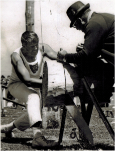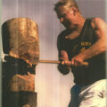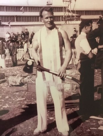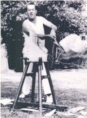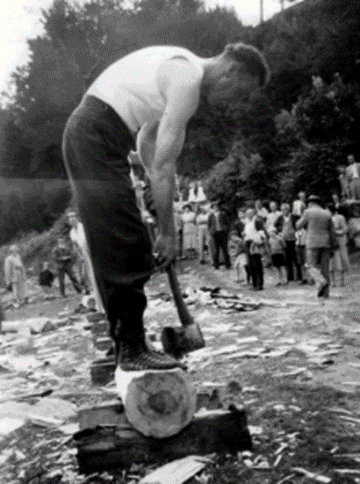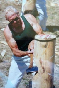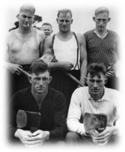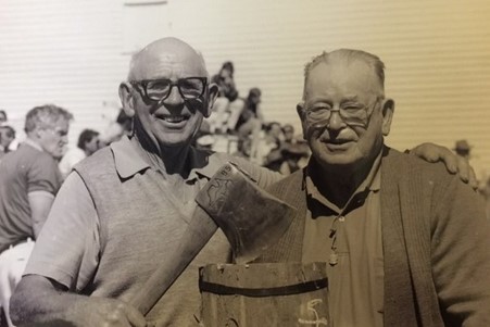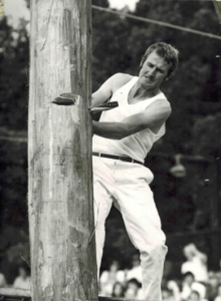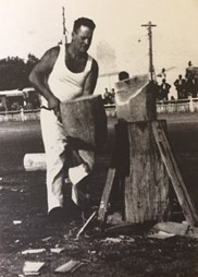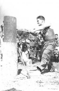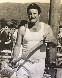 As a 30-year-old, strong and well versed in the skill and precision necessary achieved through many years of watching and listening to other axemen who were happy to share their knowledge. One of these great axemen was Jim Alexander who had a great influence on Gordon – he not only taught Gordon to cut a log correctly, he taught him to believe in himself and the power of positive thinking. Gordon took on board Jim’s four most important things in woodchopping: Breathing, Relaxation, Confidence and Common sense. And he followed up with the instruction to always stand up straight and fill up with air before an event. Jim excelled in the Underhand, and there was no-one better to teach a young man the art of woodchopping than a big strong man who was a gentle giant and a world champion axeman who loved giving advice and helping others. Gordon has said that it was great thrill for him to have Jim helping him and that Jim inspired him to go home and PRACTICE, PRACTICE, PRACTICE.